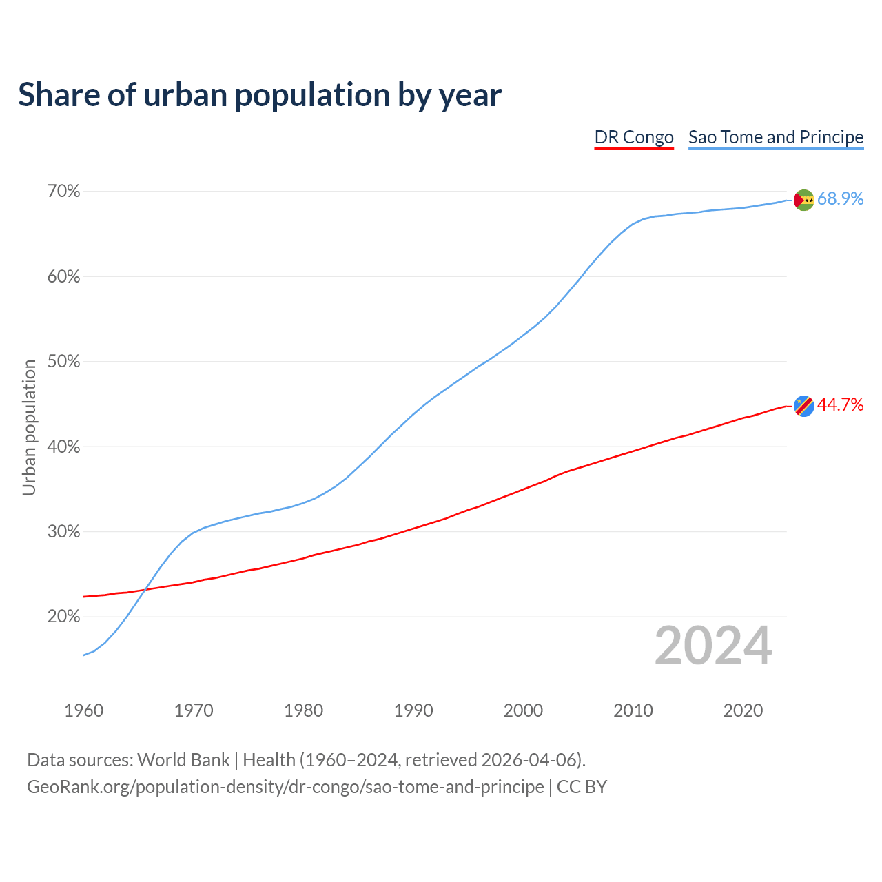 From 2004 to 2024, the share of urban population changed from 37% to 44.7% in the DR Congo and from 57.9% to 68.9% in Sao Tome and Principe.