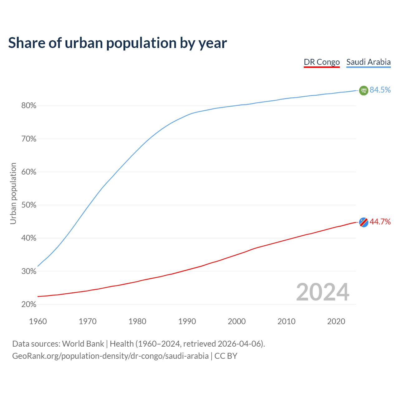 From 2004 to 2024, the share of urban population changed from 37% to 44.7% in the DR Congo and from 80.8% to 84.5% in Saudi Arabia.