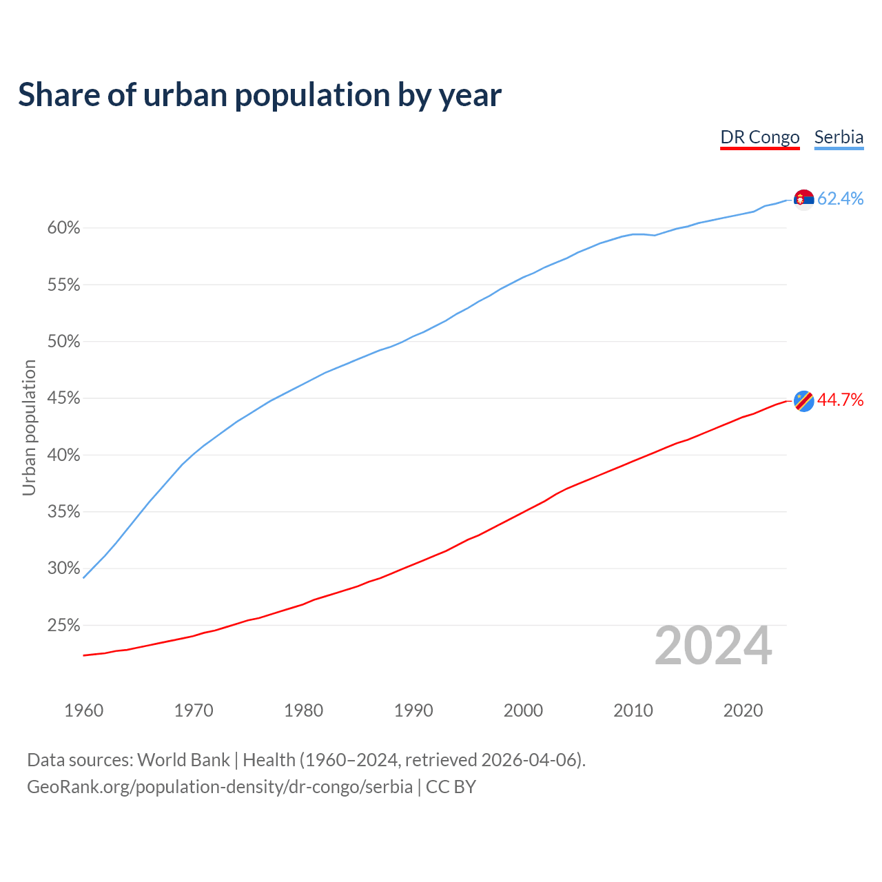 From 2004 to 2024, the share of urban population changed from 37% to 44.7% in the DR Congo and from 57.3% to 62.4% in Serbia.