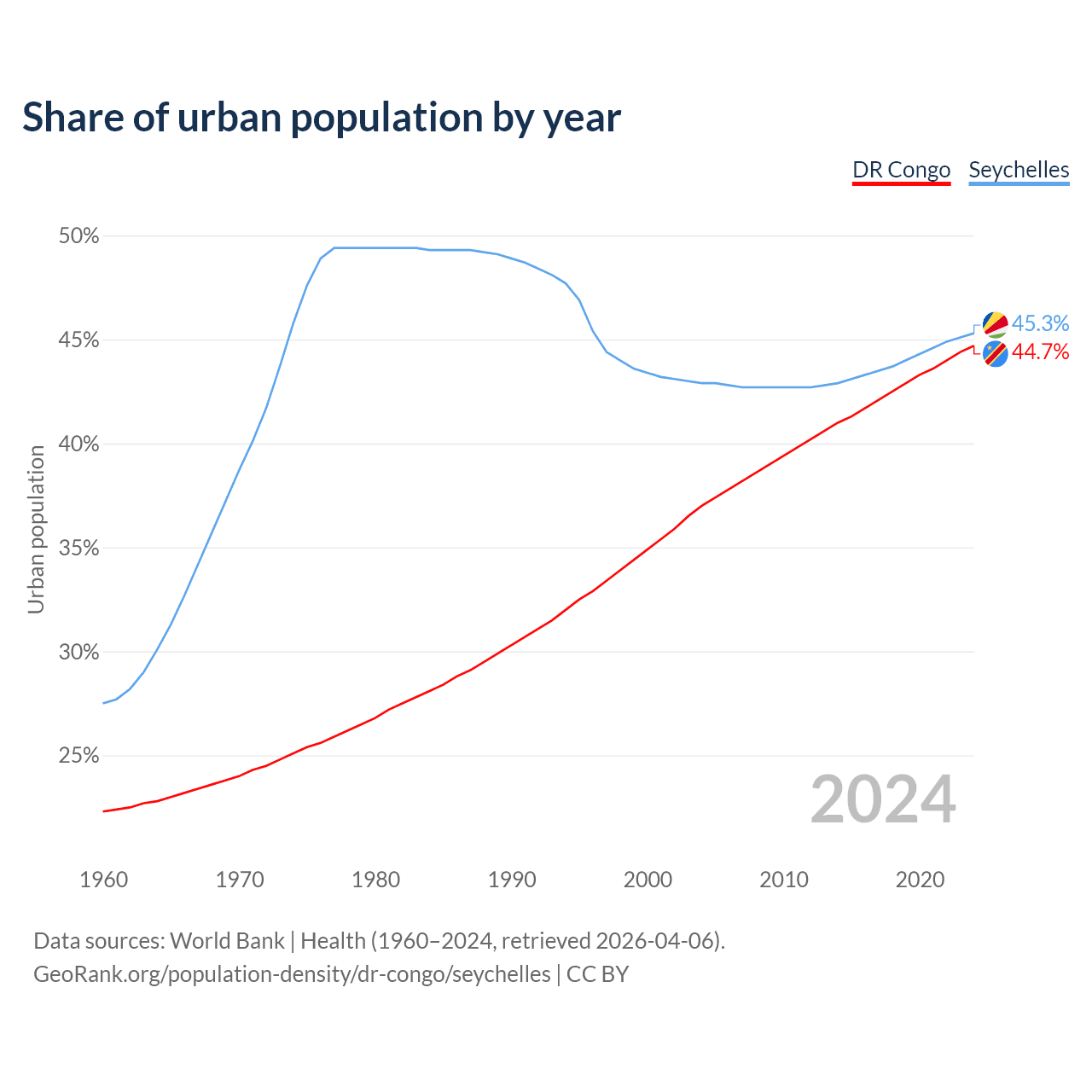 From 2004 to 2024, the share of urban population changed from 37% to 44.7% in the DR Congo and from 42.9% to 45.3% in the Seychelles.