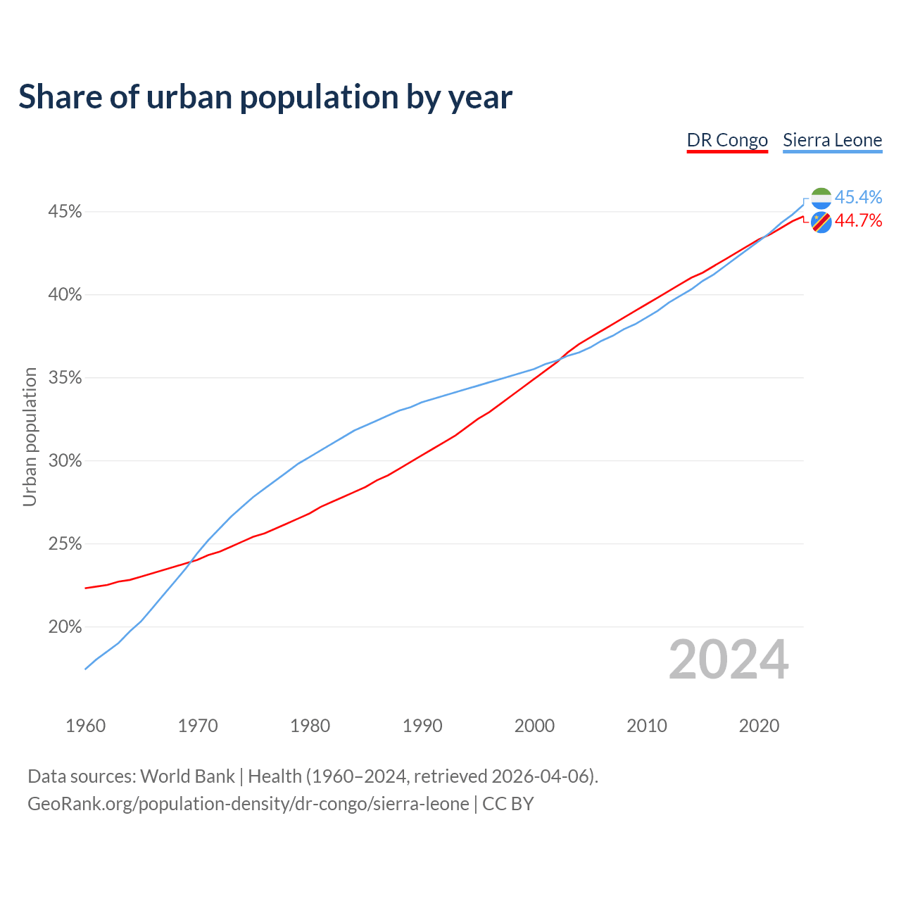 From 2004 to 2024, the share of urban population changed from 37% to 44.7% in the DR Congo and from 36.5% to 45.4% in Sierra Leone.