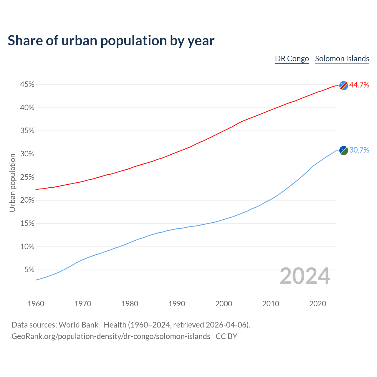 From 2004 to 2024, the share of urban population changed from 37% to 44.7% in the DR Congo and from 17.2% to 30.7% in the Solomon Islands.
