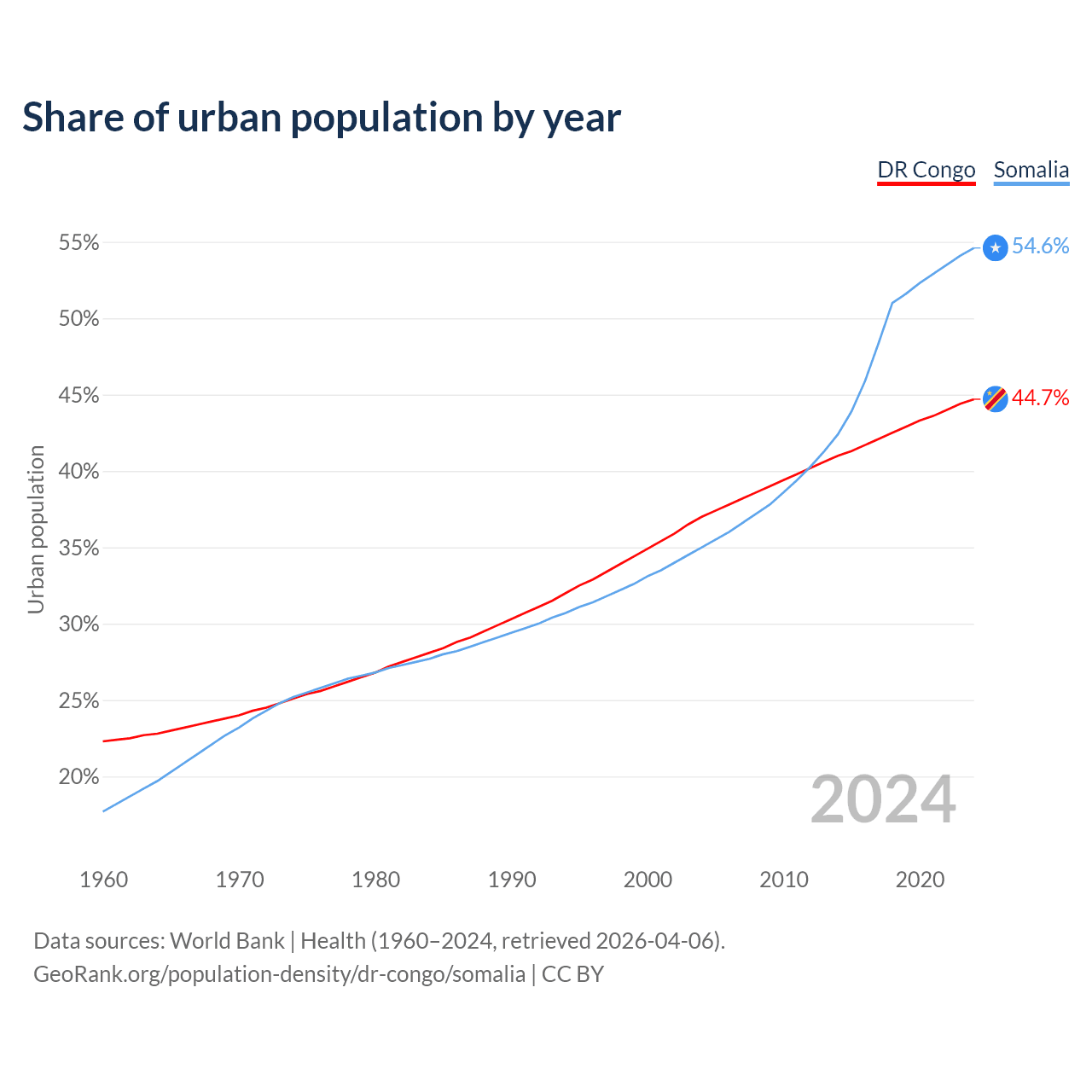 From 2004 to 2024, the share of urban population changed from 37% to 44.7% in the DR Congo and from 35% to 54.6% in Somalia.