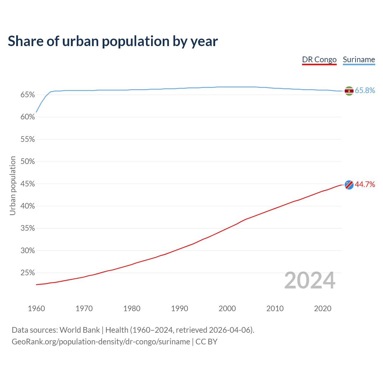 From 2004 to 2024, the share of urban population changed from 37% to 44.7% in the DR Congo and from 66.7% to 65.8% in Suriname.
