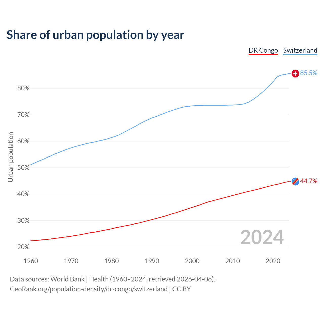 From 2004 to 2024, the share of urban population changed from 37% to 44.7% in the DR Congo and from 73.5% to 85.5% in Switzerland.