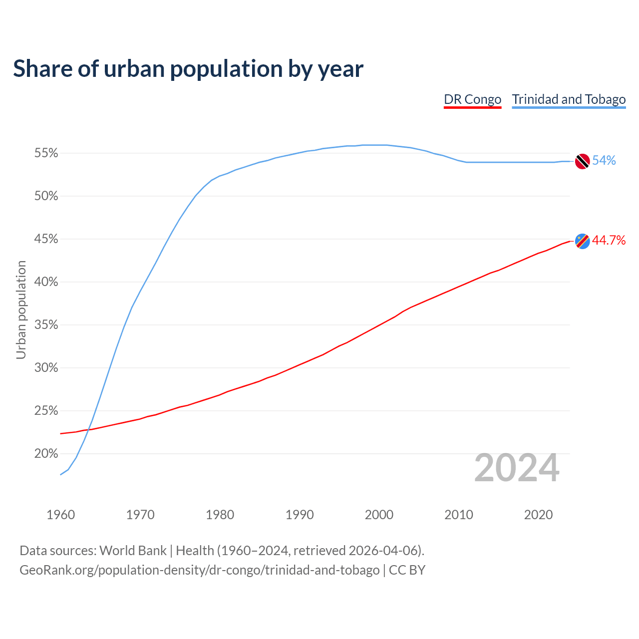 From 2004 to 2024, the share of urban population changed from 37% to 44.7% in the DR Congo and from 55.6% to 54% in Trinidad and Tobago.