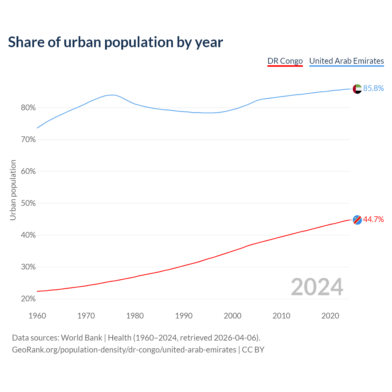 From 2004 to 2024, the share of urban population changed from 37% to 44.7% in the DR Congo and from 81.5% to 85.8% in the United Arab Emirates.