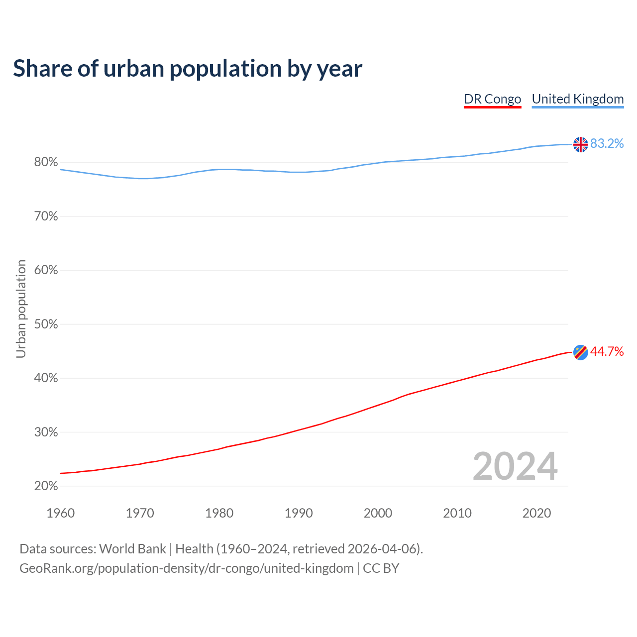 From 2004 to 2024, the share of urban population changed from 37% to 44.7% in the DR Congo and from 80.3% to 83.2% in the United Kingdom.