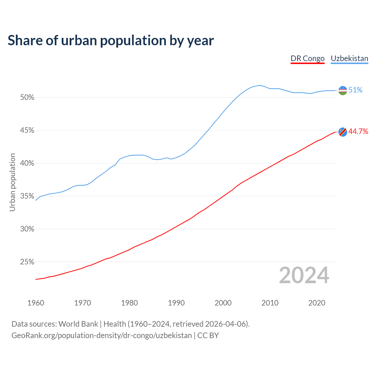 From 2004 to 2024, the share of urban population changed from 37% to 44.7% in the DR Congo and from 50.6% to 51% in Uzbekistan.