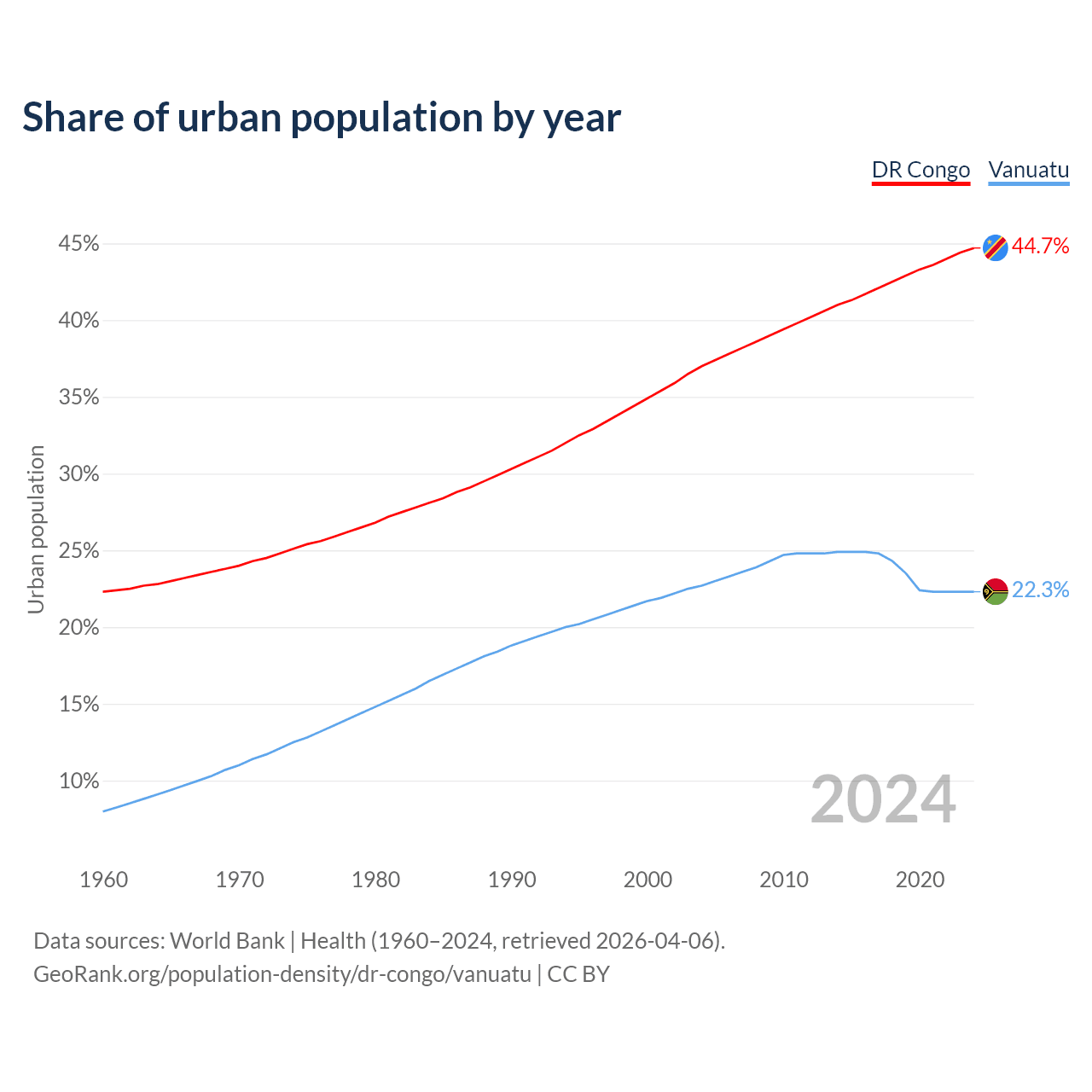 From 2004 to 2024, the share of urban population changed from 37% to 44.7% in the DR Congo and from 22.7% to 22.3% in Vanuatu.