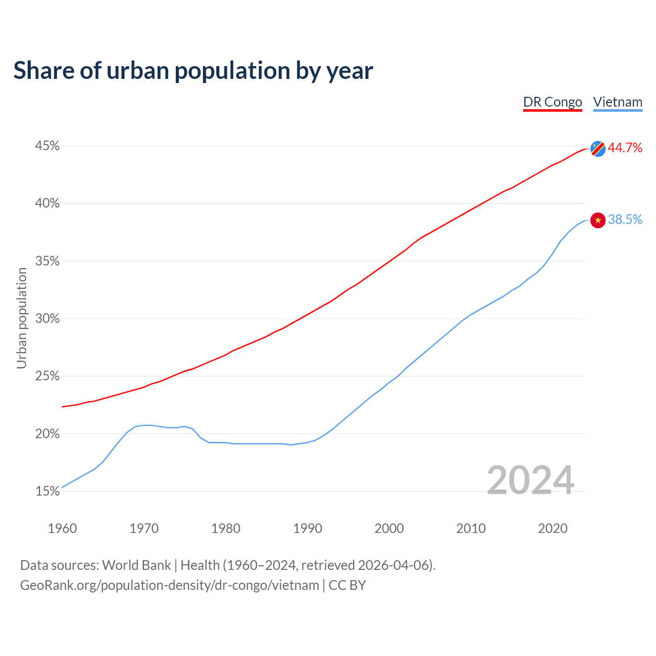 From 2004 to 2024, the share of urban population changed from 37% to 44.7% in the DR Congo and from 26.8% to 38.5% in Vietnam.