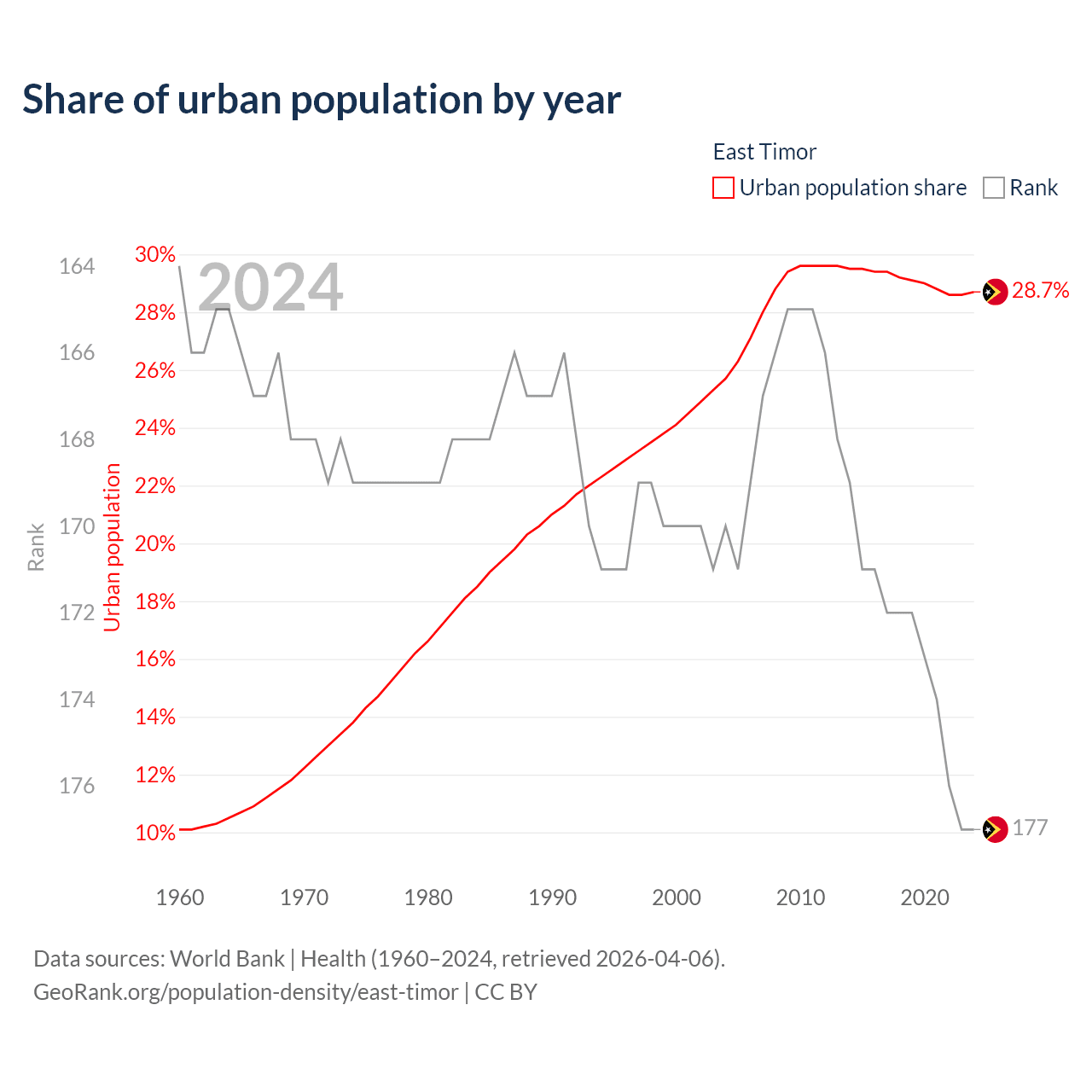 This chart shows the share of urban population in East Timor from 1960 to 2024: 10.1% lived in urban areas in 1960, 24.1% in 2000, and 28.7% in 2024.