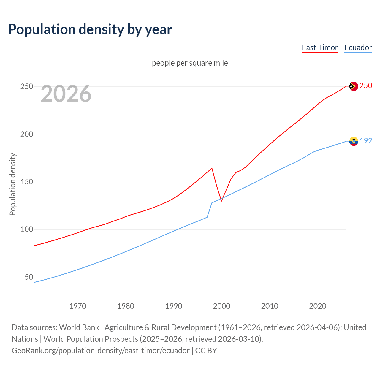 From 2006 to 2026, population density in East Timor increased by 47.1%, compared to a 30.9% growth in Ecuador.