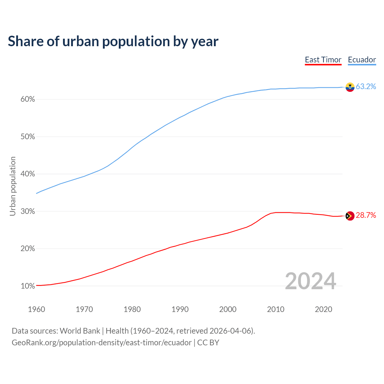 From 2004 to 2024, the share of urban population changed from 25.7% to 28.7% in East Timor and from 61.8% to 63.2% in Ecuador.