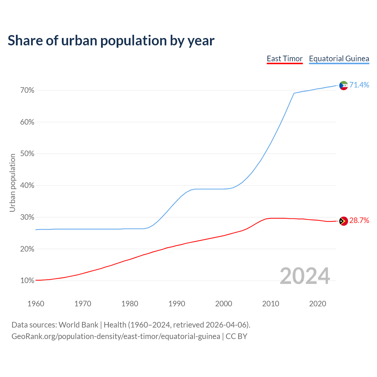 From 2004 to 2024, the share of urban population changed from 25.7% to 28.7% in East Timor and from 40.9% to 71.4% in Equatorial Guinea.