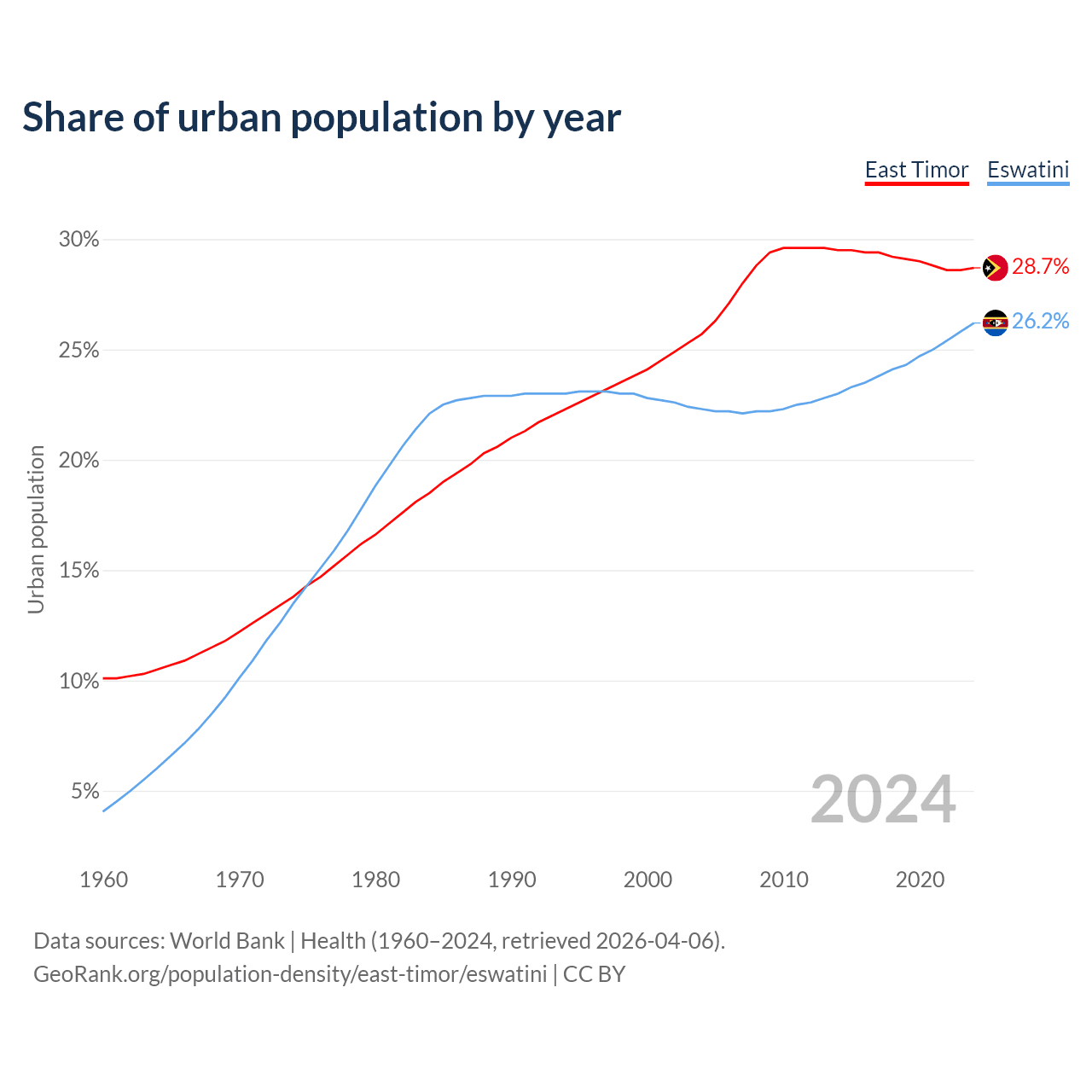 From 2004 to 2024, the share of urban population changed from 25.7% to 28.7% in East Timor and from 22.3% to 26.2% in Eswatini.