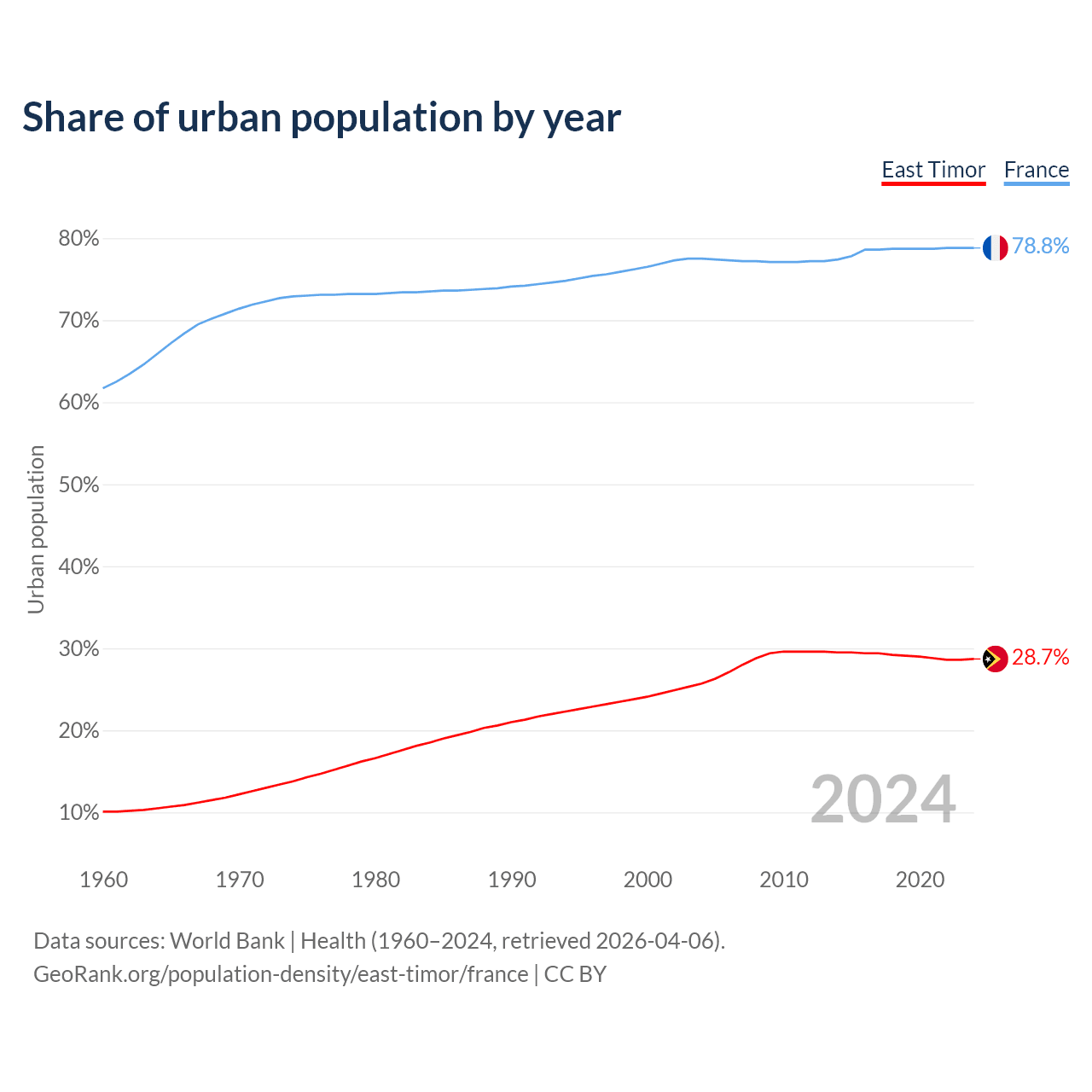From 2004 to 2024, the share of urban population changed from 25.7% to 28.7% in East Timor and from 77.5% to 78.8% in France.