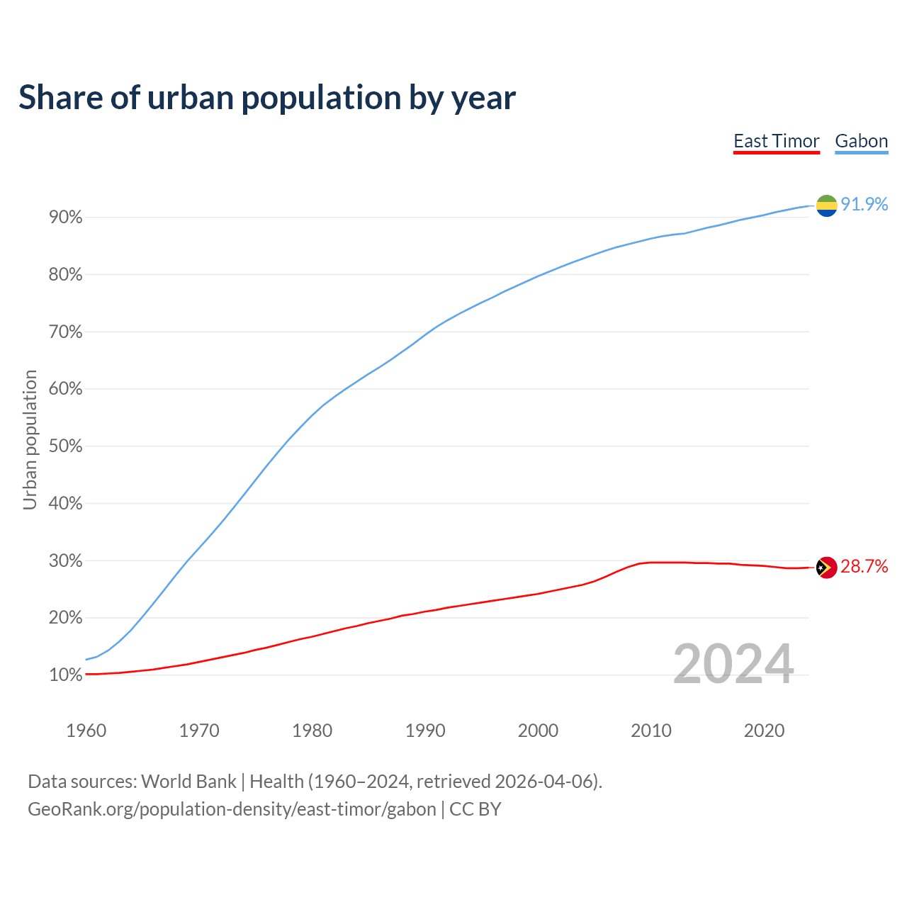 From 2004 to 2024, the share of urban population changed from 25.7% to 28.7% in East Timor and from 82.7% to 91.9% in Gabon.