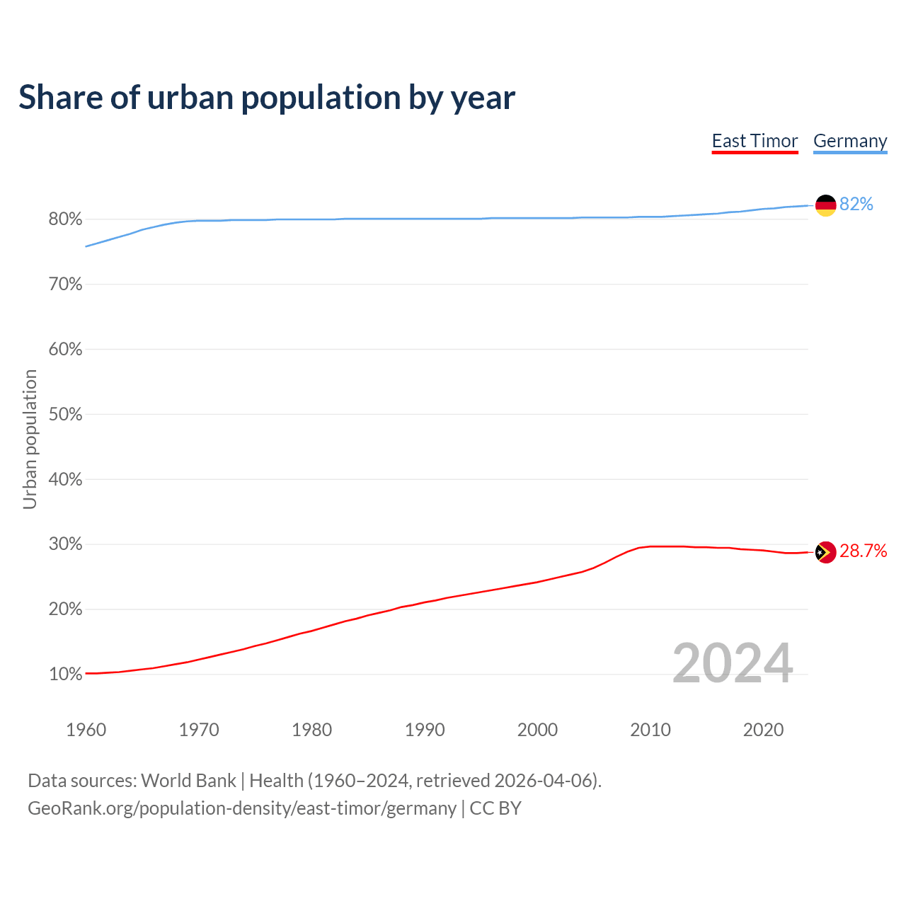 From 2004 to 2024, the share of urban population changed from 25.7% to 28.7% in East Timor and from 80.2% to 82% in Germany.
