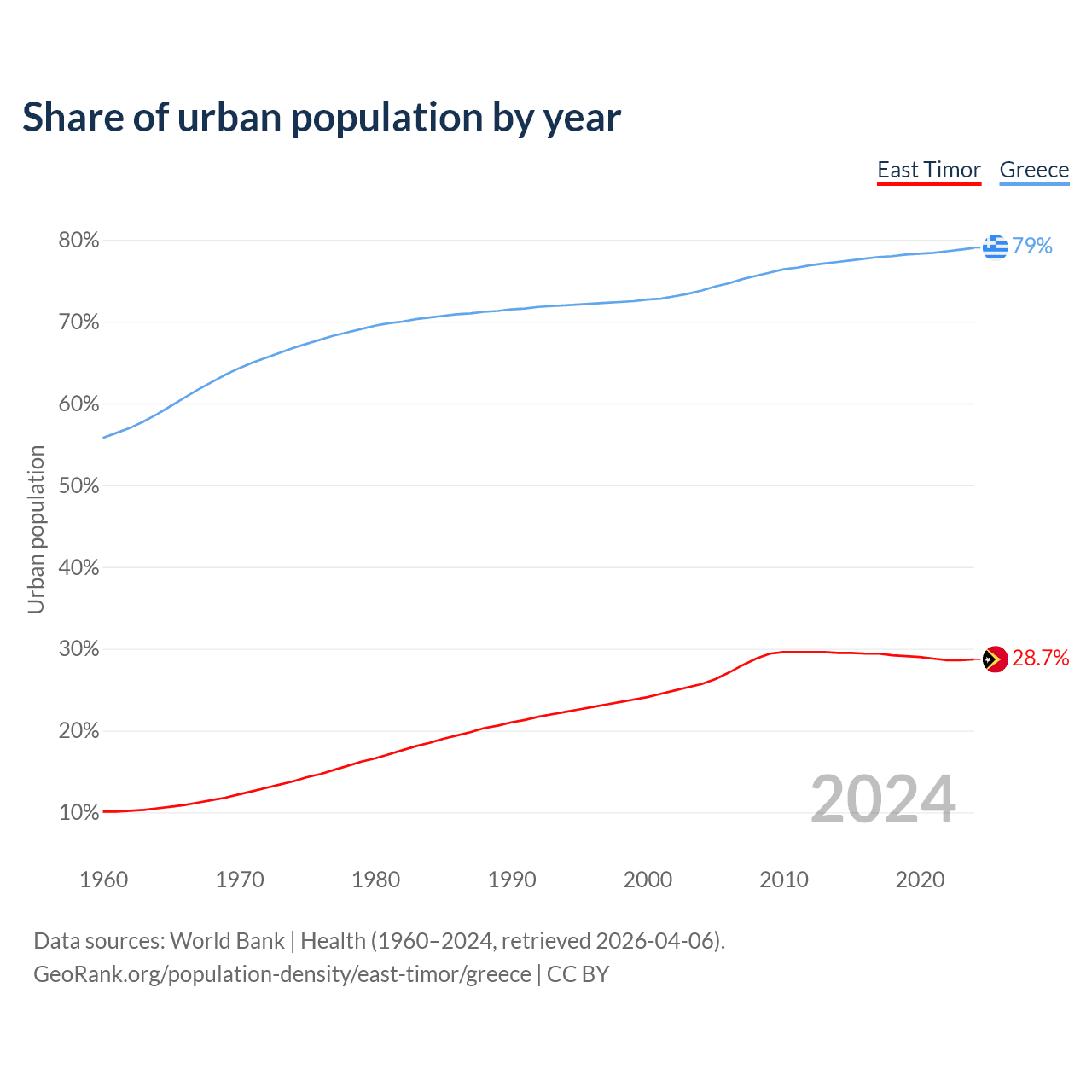 From 2004 to 2024, the share of urban population changed from 25.7% to 28.7% in East Timor and from 73.8% to 79% in Greece.