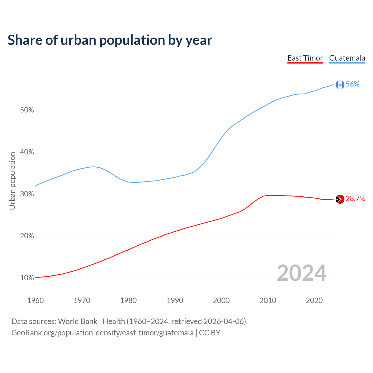 From 2004 to 2024, the share of urban population changed from 25.7% to 28.7% in East Timor and from 47.3% to 56% in Guatemala.