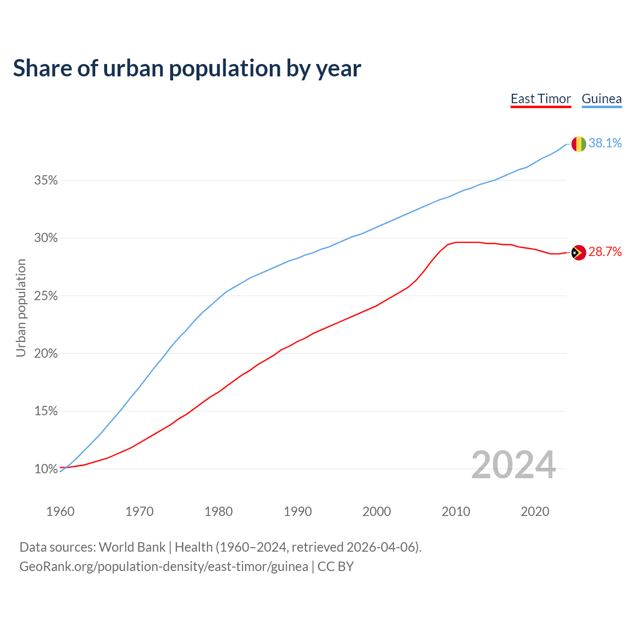 From 2004 to 2024, the share of urban population changed from 25.7% to 28.7% in East Timor and from 32.1% to 38.1% in Guinea.