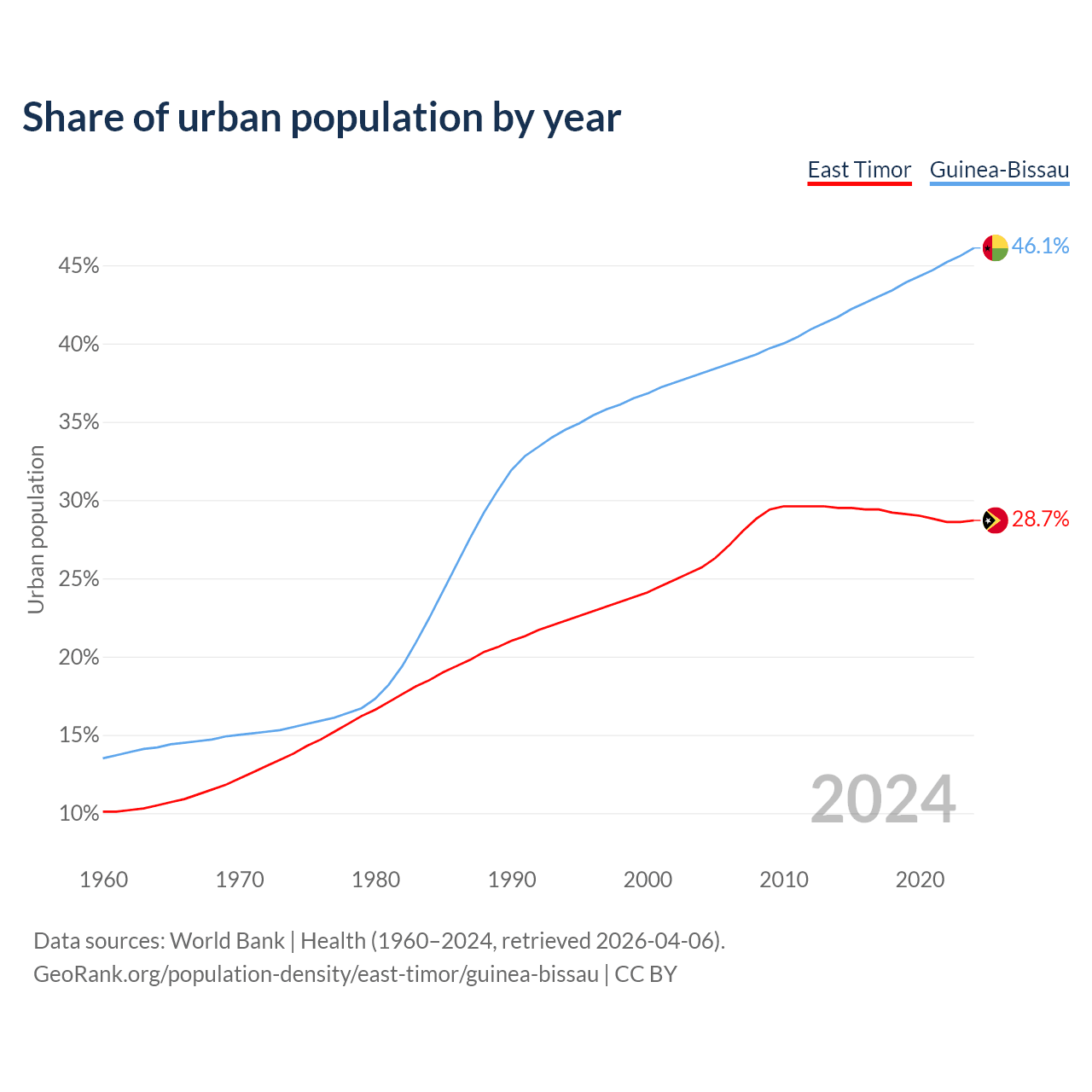 From 2004 to 2024, the share of urban population changed from 25.7% to 28.7% in East Timor and from 38.1% to 46.1% in Guinea-Bissau.