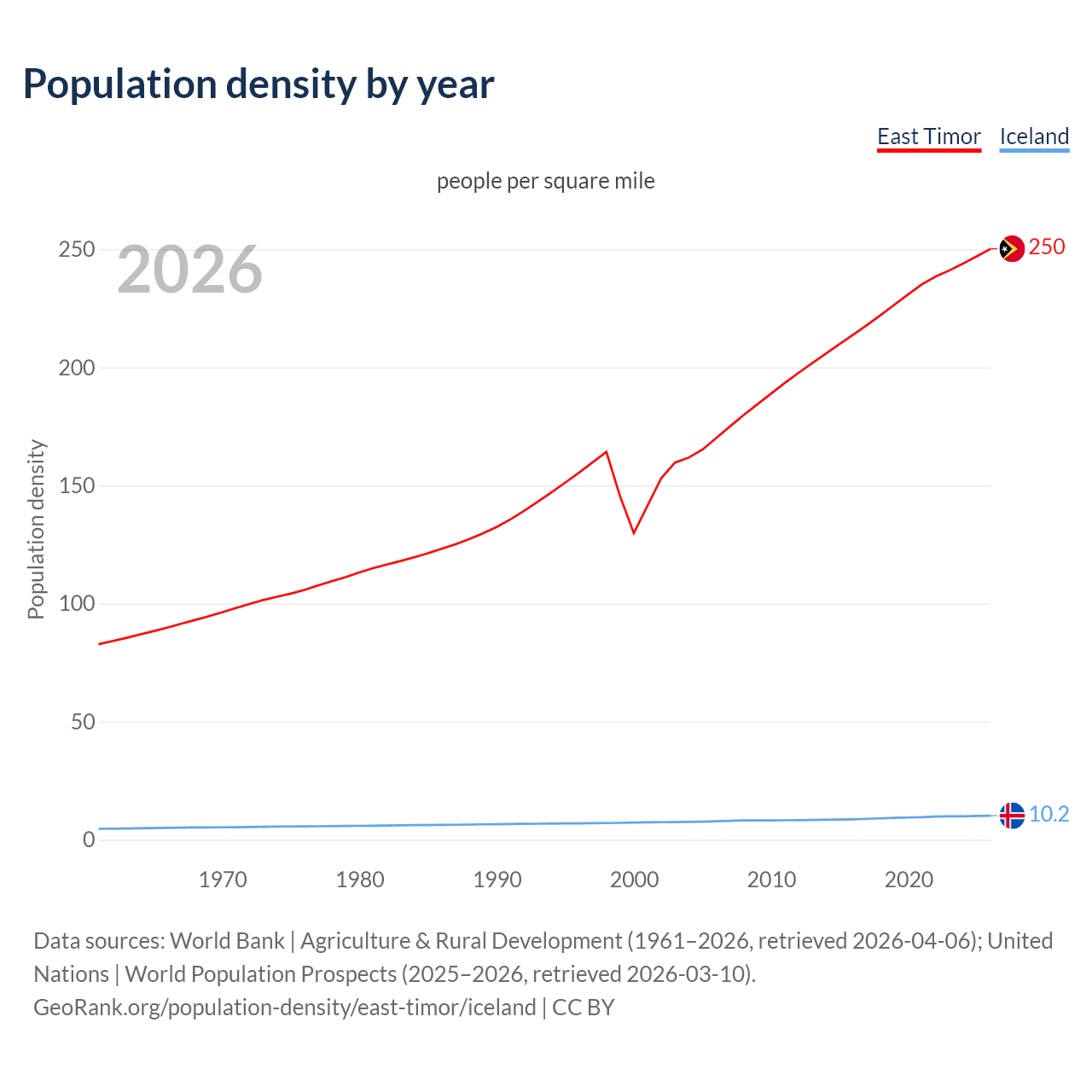 From 2006 to 2026, population density in East Timor increased by 47.1%, compared to a 29.7% growth in Iceland.
