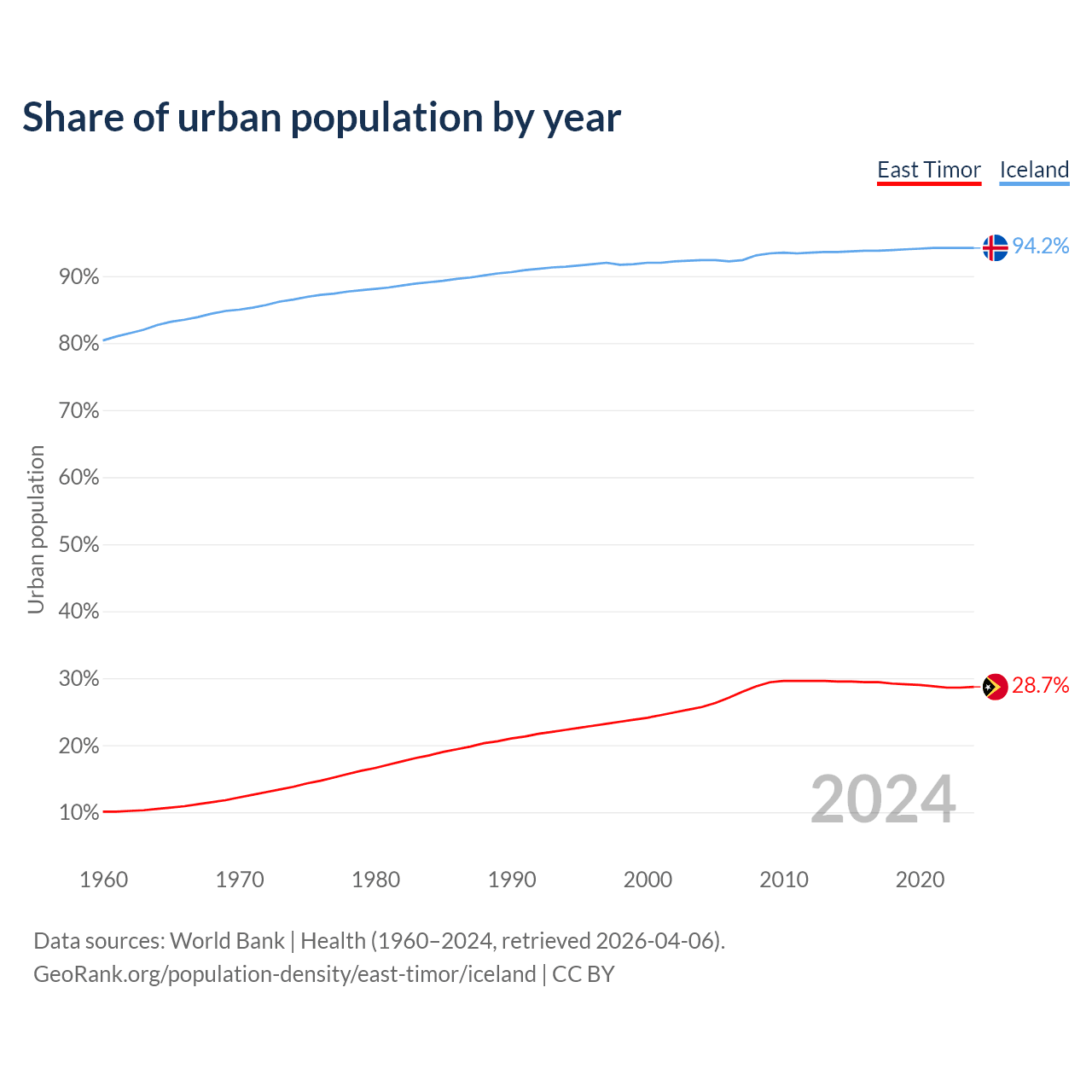 From 2004 to 2024, the share of urban population changed from 25.7% to 28.7% in East Timor and from 92.4% to 94.2% in Iceland.