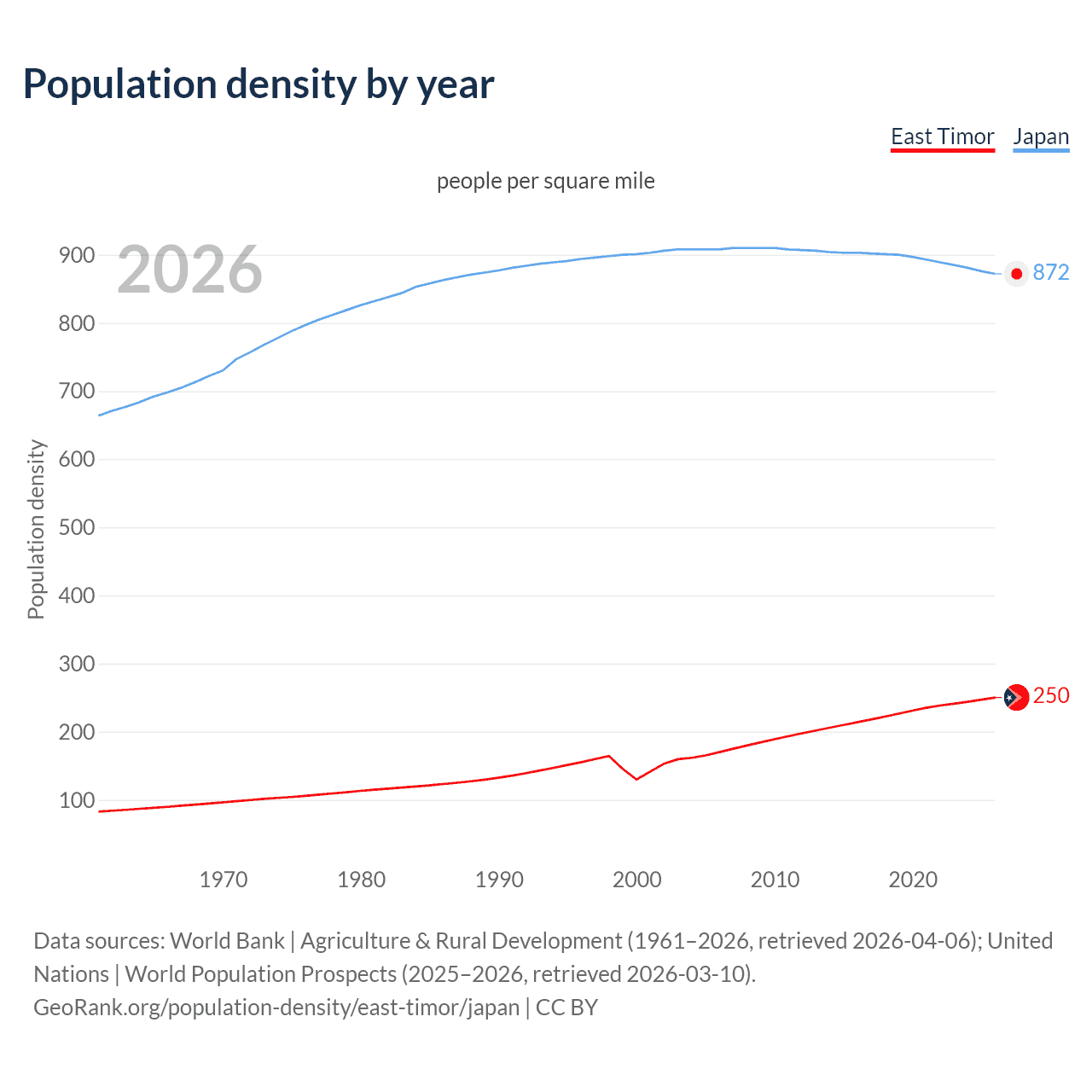 From 2006 to 2026, population density in East Timor increased by 47.1%, compared to a 4.07% decline in Japan.