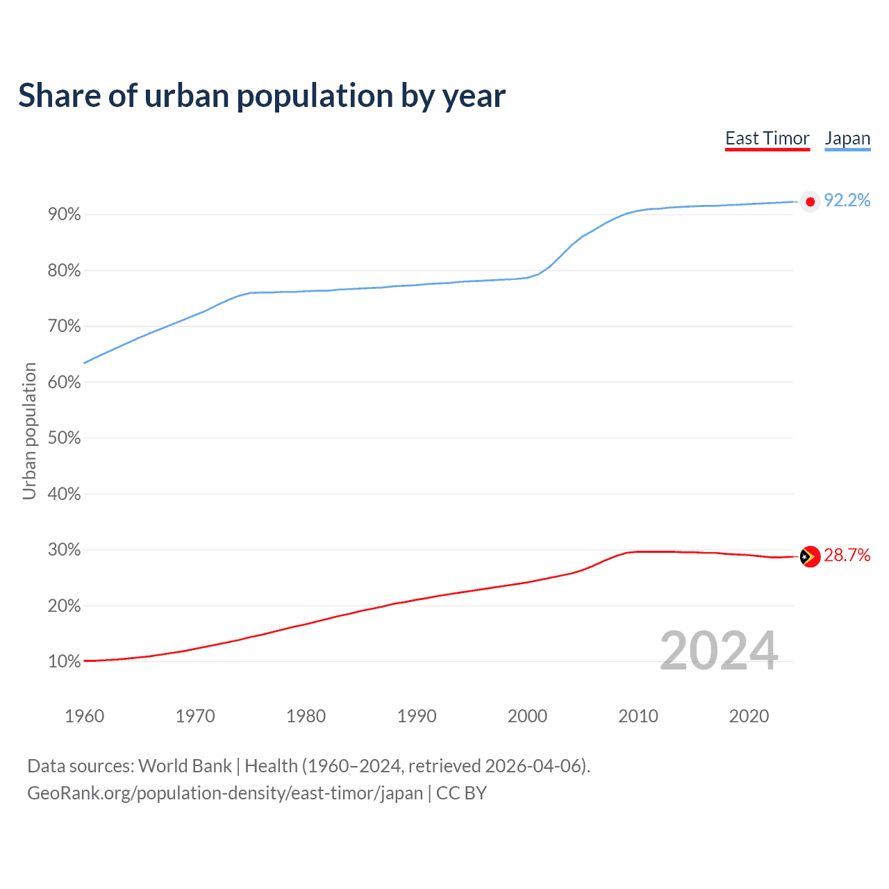 From 2004 to 2024, the share of urban population changed from 25.7% to 28.7% in East Timor and from 84.4% to 92.2% in Japan.