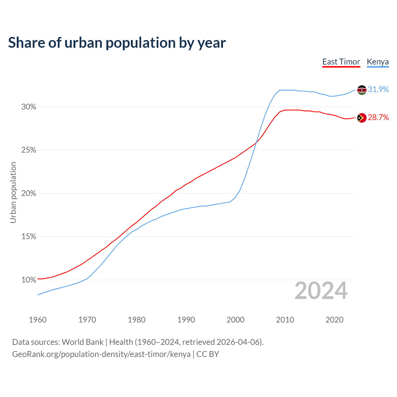 From 2004 to 2024, the share of urban population changed from 25.7% to 28.7% in East Timor and from 25.4% to 31.9% in Kenya.