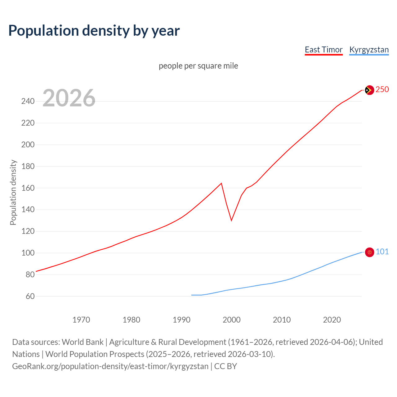 From 2006 to 2026, population density in East Timor increased by 47.1%, compared to a 42.6% growth in Kyrgyzstan.