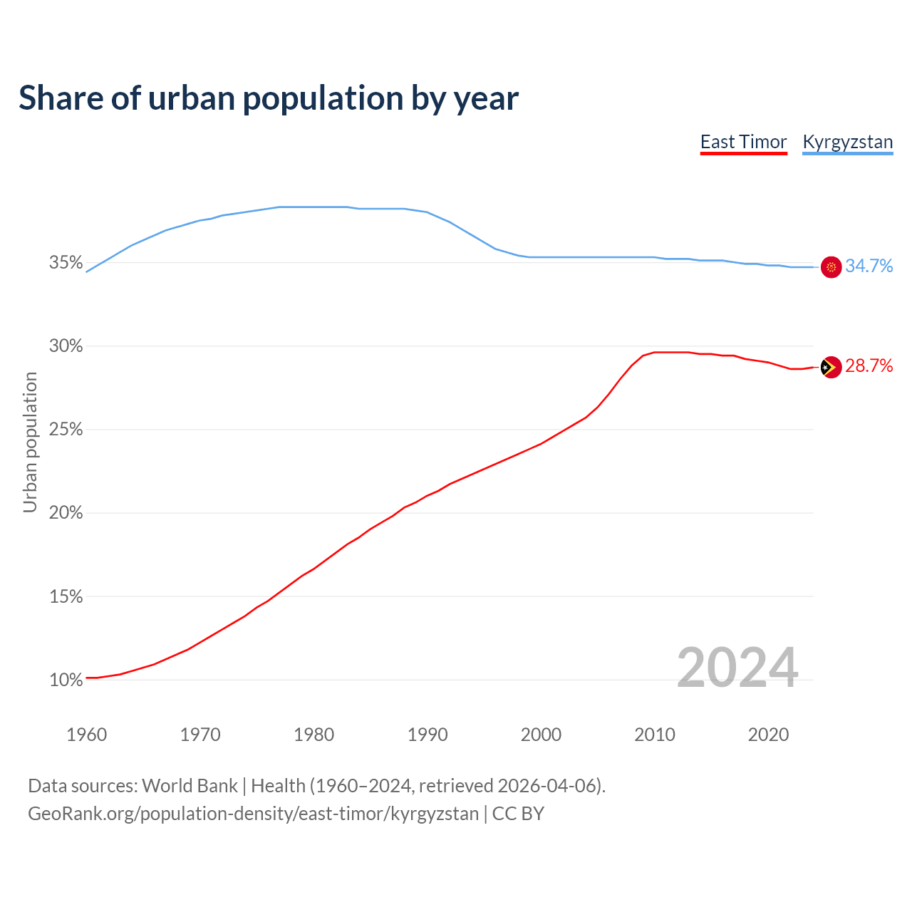 From 2004 to 2024, the share of urban population changed from 25.7% to 28.7% in East Timor and from 35.3% to 34.7% in Kyrgyzstan.