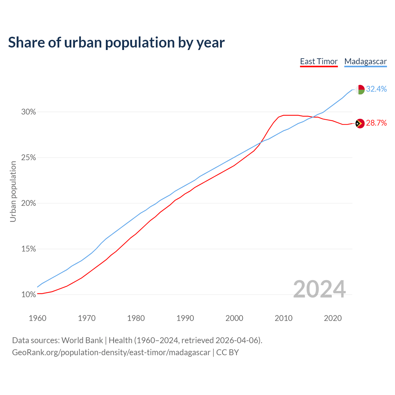 From 2004 to 2024, the share of urban population changed from 25.7% to 28.7% in East Timor and from 26.2% to 32.4% in Madagascar.