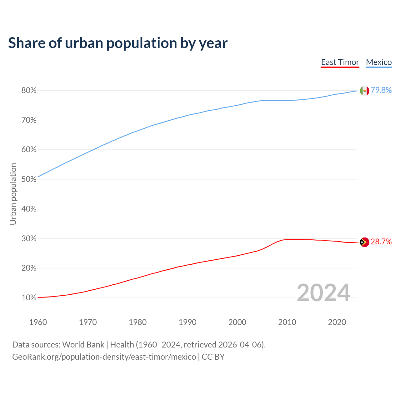 From 2004 to 2024, the share of urban population changed from 25.7% to 28.7% in East Timor and from 76.3% to 79.8% in Mexico.