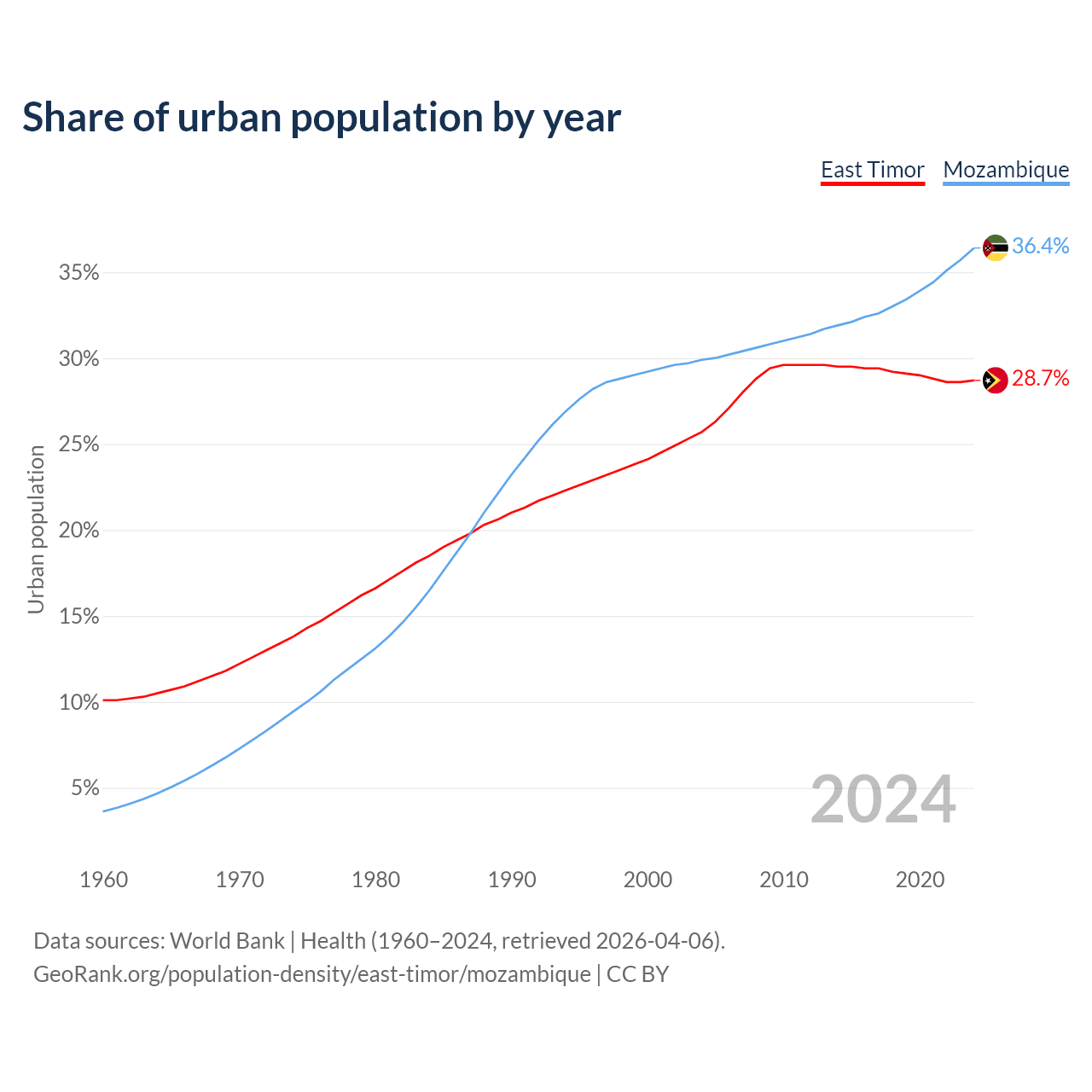 From 2006 to 2026, population density in East Timor increased by 47.1%, compared to a 76.4% growth in Mozambique.
