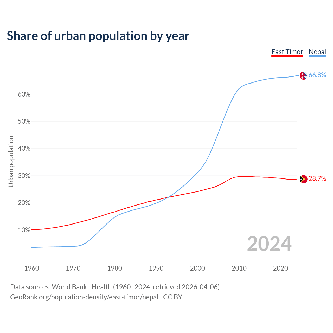 From 2004 to 2024, the share of urban population changed from 25.7% to 28.7% in East Timor and from 41.6% to 66.8% in Nepal.