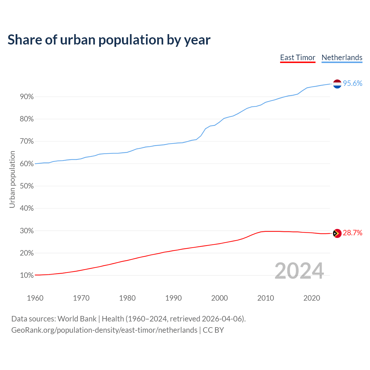 From 2004 to 2024, the share of urban population changed from 25.7% to 28.7% in East Timor and from 82.3% to 95.6% in the Netherlands.
