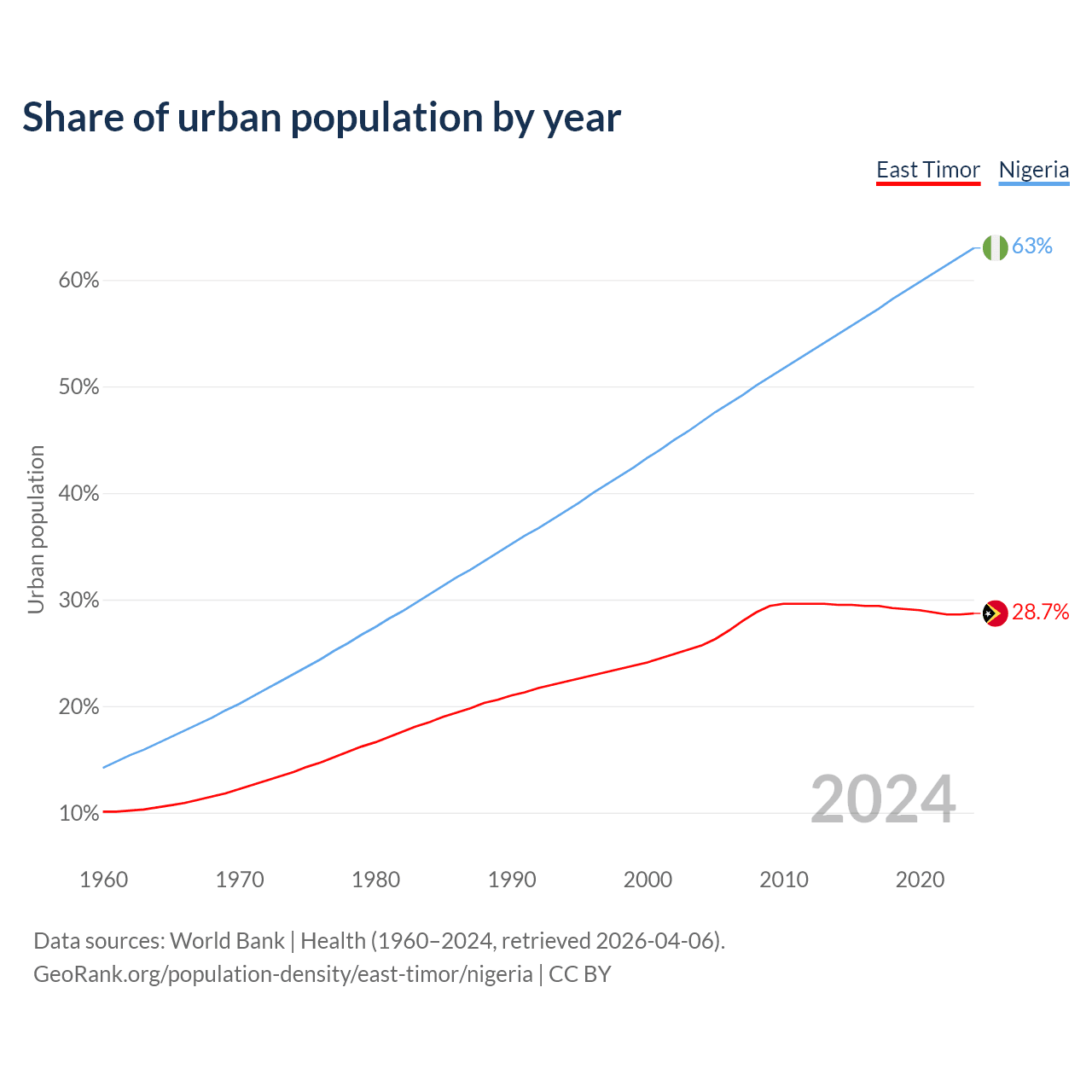 From 2004 to 2024, the share of urban population changed from 25.7% to 28.7% in East Timor and from 46.7% to 63% in Nigeria.