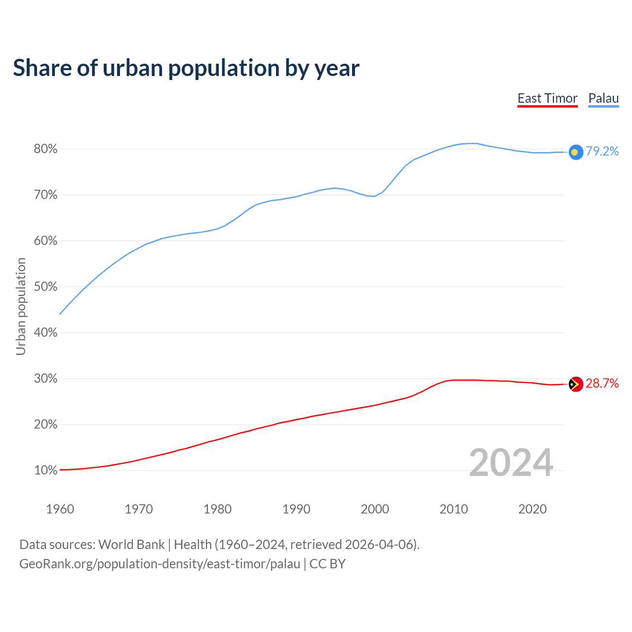 From 2004 to 2024, the share of urban population changed from 25.7% to 28.7% in East Timor and from 76.4% to 79.2% in Palau.