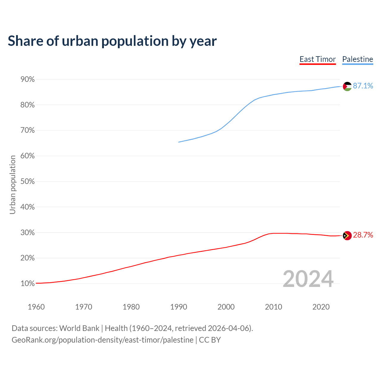 From 2004 to 2024, the share of urban population changed from 25.7% to 28.7% in East Timor and from 79% to 87.1% in Palestine.