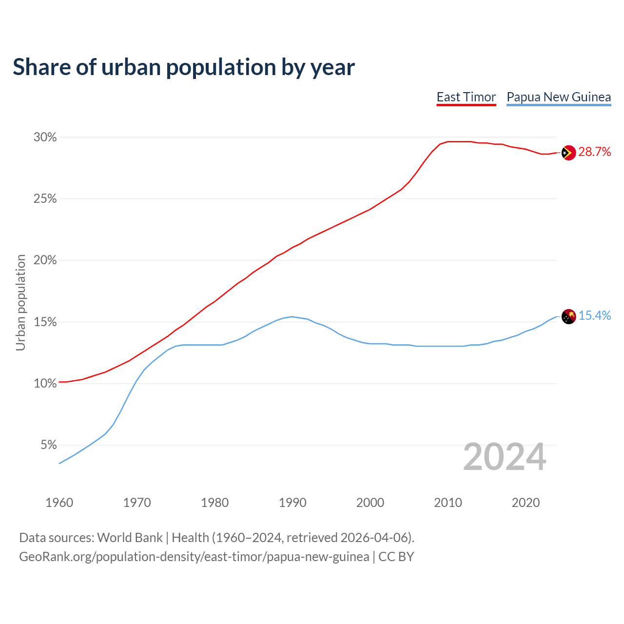 From 2004 to 2024, the share of urban population changed from 25.7% to 28.7% in East Timor and from 13.1% to 15.4% in Papua New Guinea.