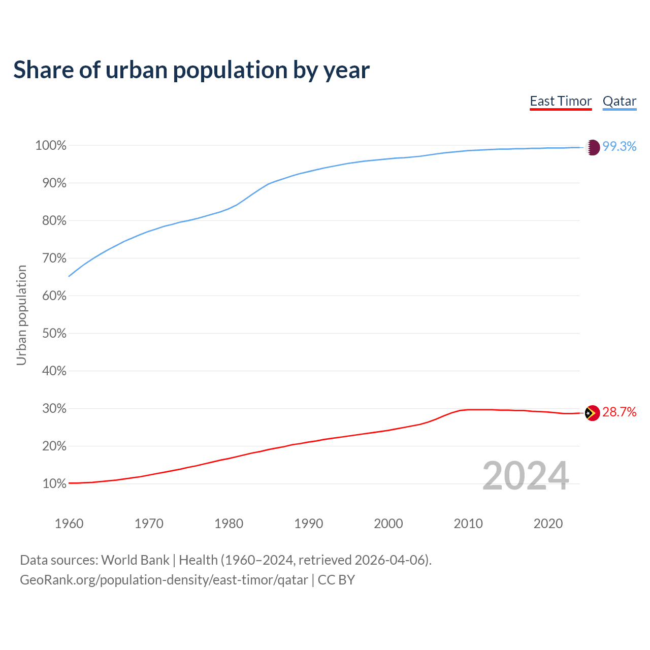 From 2004 to 2024, the share of urban population changed from 25.7% to 28.7% in East Timor and from 97% to 99.3% in Qatar.