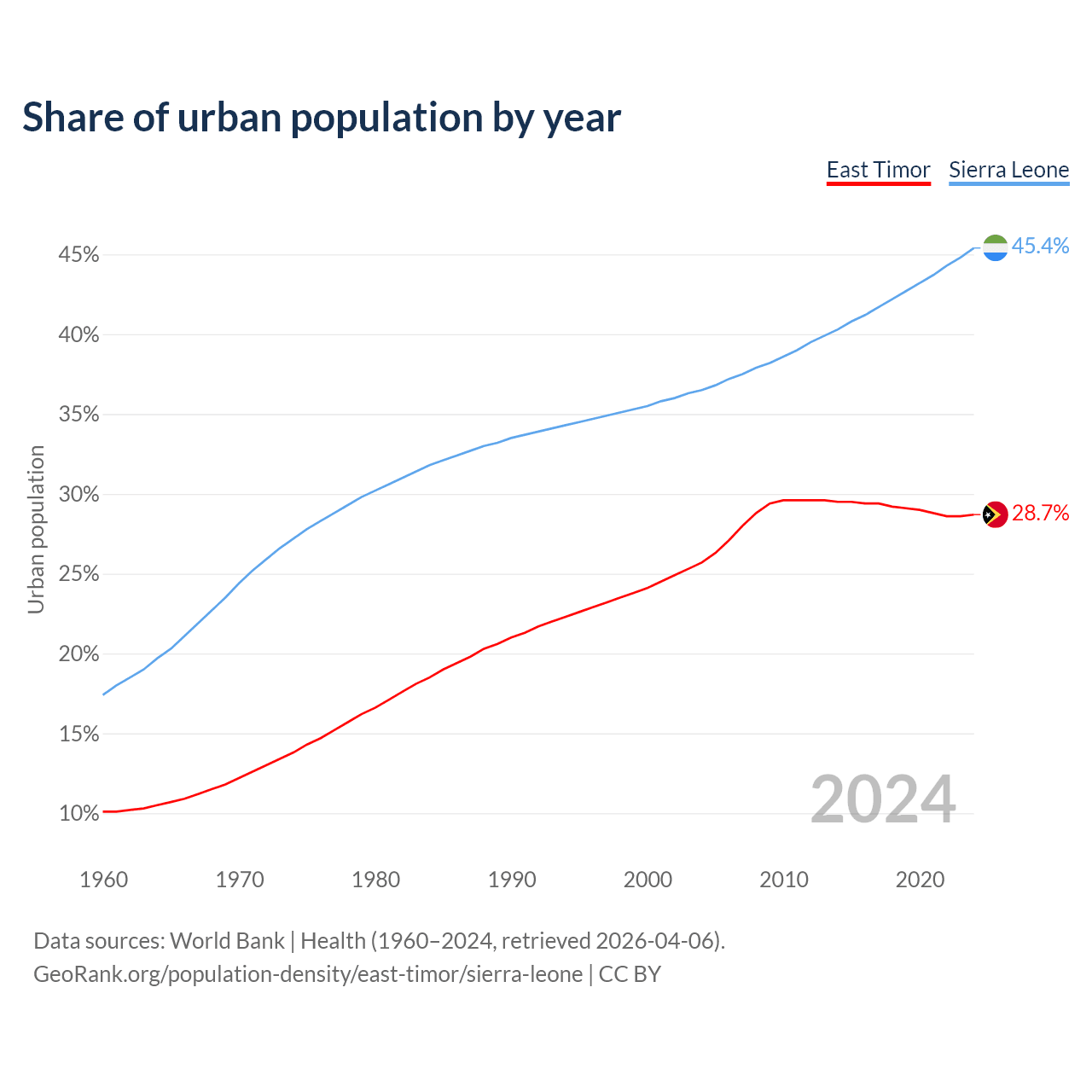 From 2006 to 2026, population density in East Timor increased by 47.1%, compared to a 60% growth in Sierra Leone.