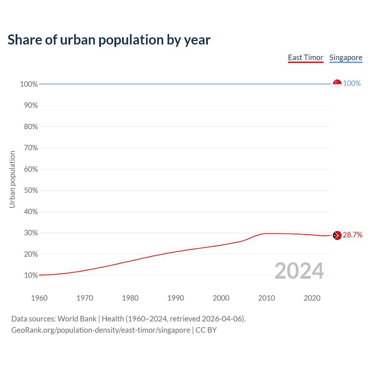 From 2004 to 2024, the share of urban population changed from 25.7% to 28.7% in East Timor and from 100% to 100% in Singapore.