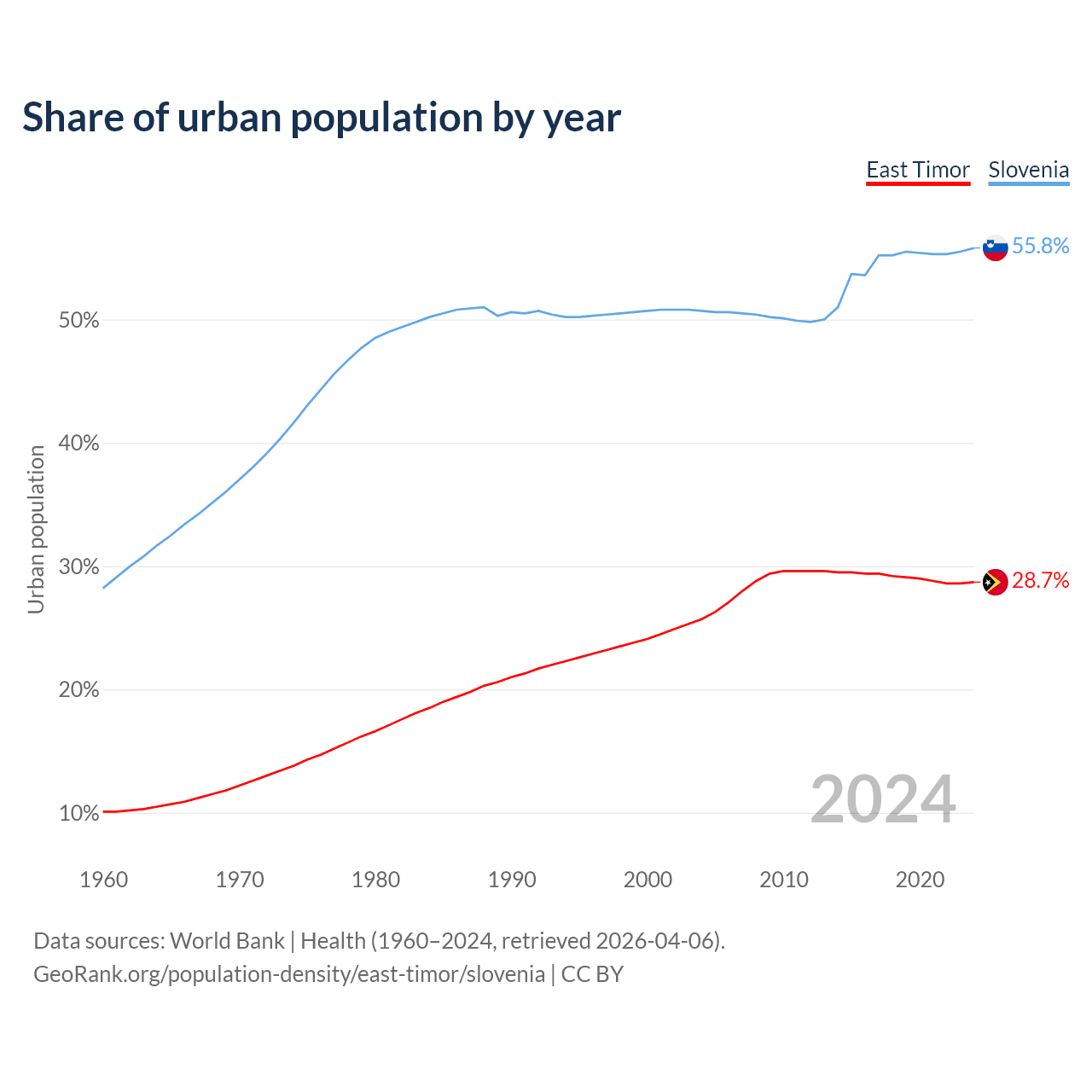 From 2004 to 2024, the share of urban population changed from 25.7% to 28.7% in East Timor and from 50.7% to 55.8% in Slovenia.