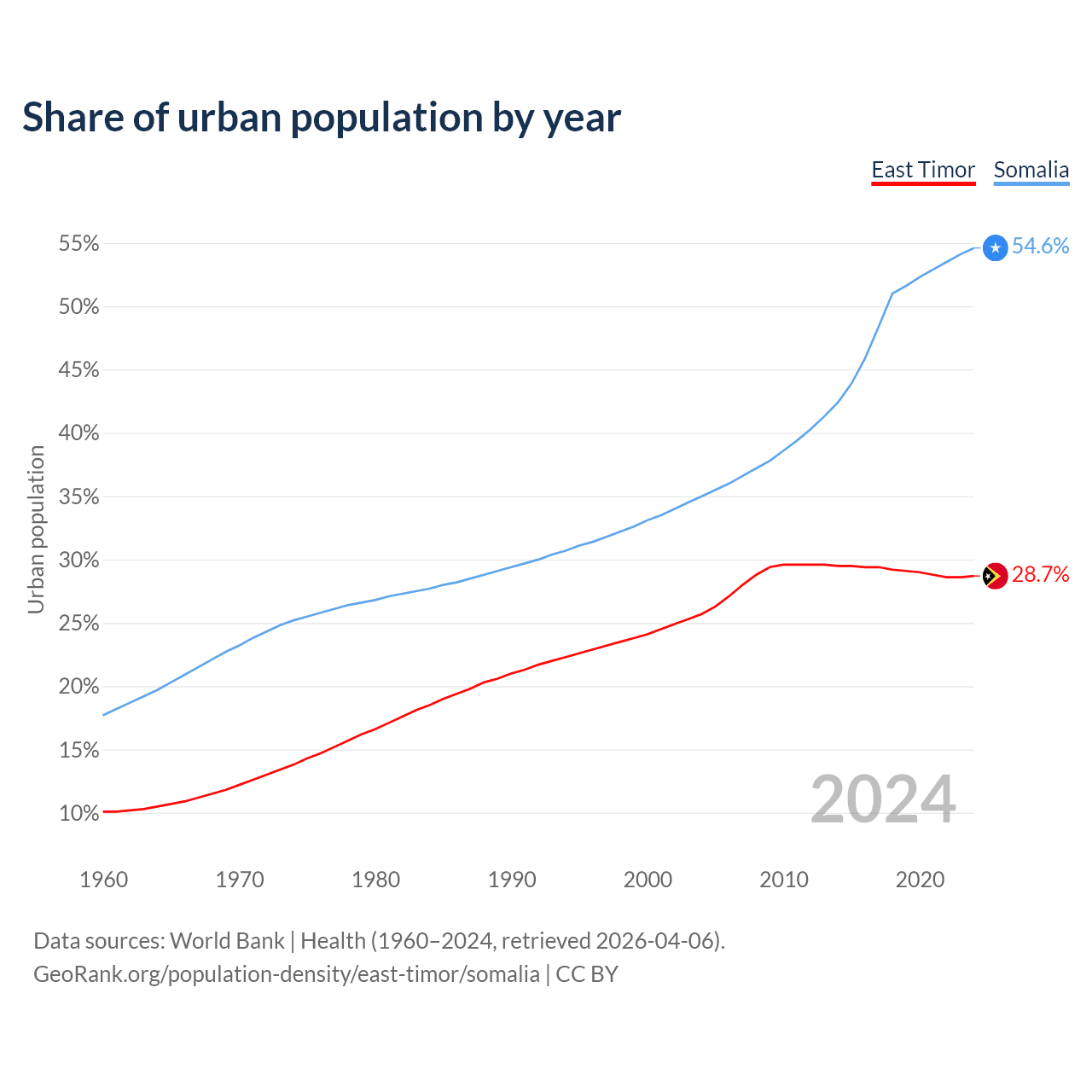 From 2004 to 2024, the share of urban population changed from 25.7% to 28.7% in East Timor and from 35% to 54.6% in Somalia.
