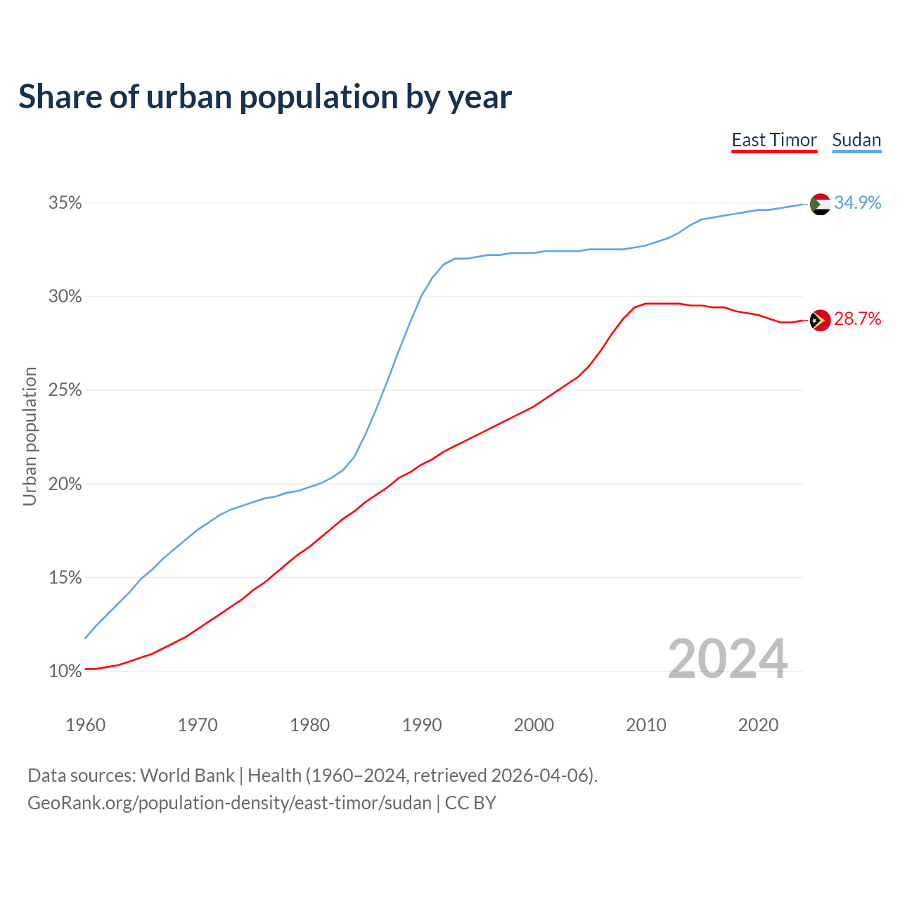 From 2004 to 2024, the share of urban population changed from 25.7% to 28.7% in East Timor and from 32.4% to 34.9% in Sudan.