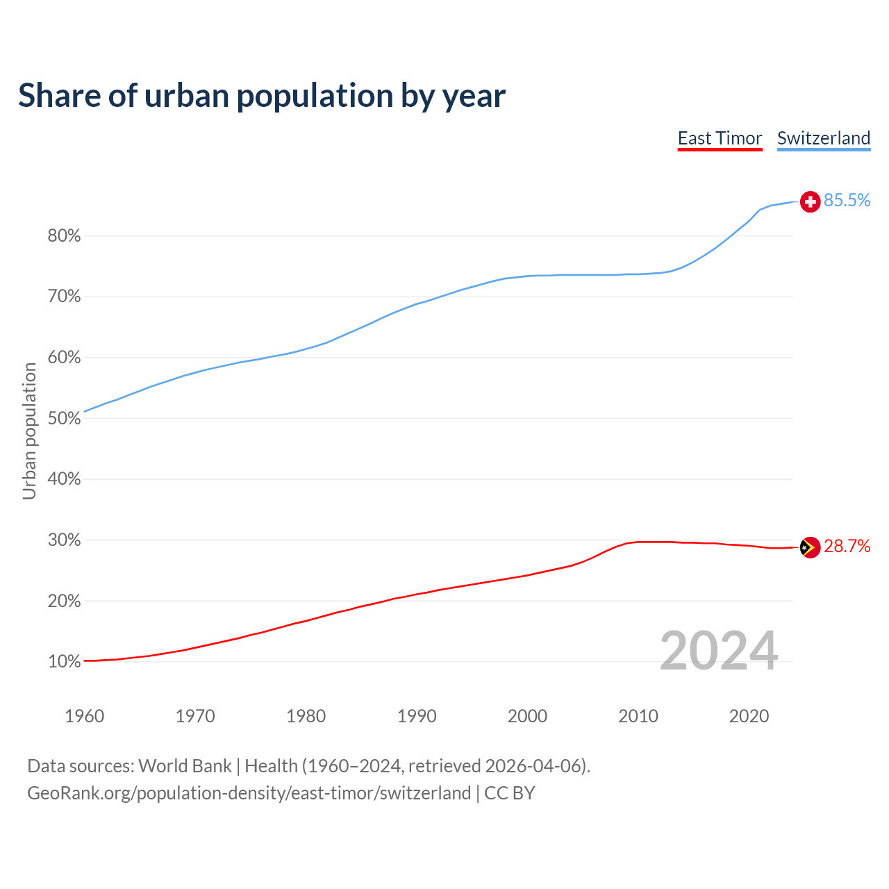 From 2004 to 2024, the share of urban population changed from 25.7% to 28.7% in East Timor and from 73.5% to 85.5% in Switzerland.